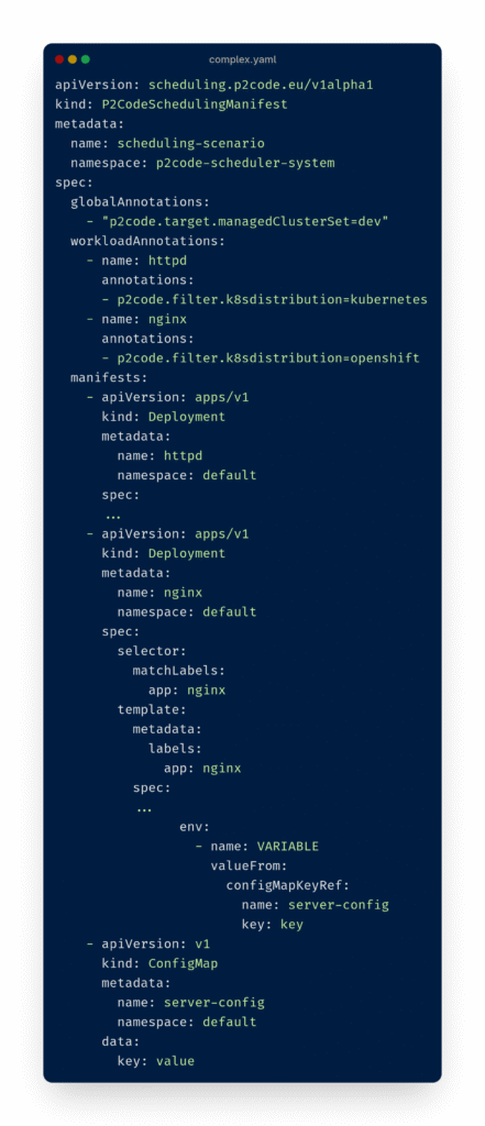 A developer must create a P2CodeSchedulingManifest to use the multicluster environment configured by the cluster administrator. To do so, a list of resources to be deployed is given  under the Manifests field of the P2CodeSchedulingManifest. The list of manifests is akin to a helm chart detailing all the components required for an application to run. Developers can provide additional scheduling requirements at the global or workload level. An annotation specified at the global level is applied to all manifests and takes precedence over any workload annotations. The target managed cluster set annotation is mandatory and defined at the global level. Optional workload annotations offer developers more fine-grained control over the scheduling of components. Developers can define a mixture of global and workload annotations in the P2CodeSchedulingManifest. For example, a developer may want all their components to run on an OpenShift cluster, while one AI workload must be scheduled to a cluster with a GPU.