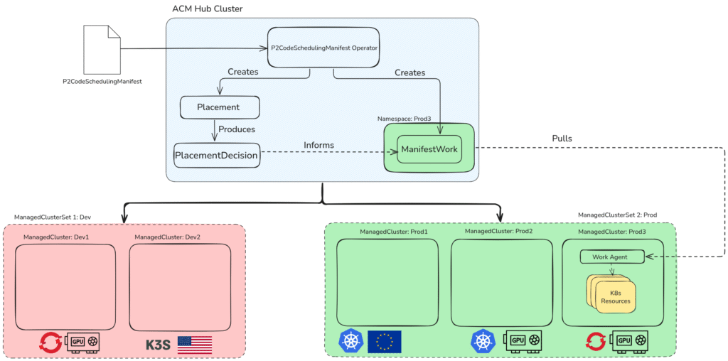 The scheduler is in fact a Kubernetes operator that leverages the ACM framework, as shown in Figure 1. It runs on the hub cluster where the ACM operator is installed and is authorized to interact with the managed clusters under the control of the hub cluster. Users can define their workloads and scheduling requirements via the P2CodeSchedulingManifest custom resource. Scheduling requirements are specified as key-value pairs, which translate to ClusterClaims, essentially labels in ACM used to highlight features of the managed cluster. ClusterClaims provide the flexibility to define any property of interest to developers. Cluster administrators are encouraged to apply ClusterClaims to distinguish the managed clusters.