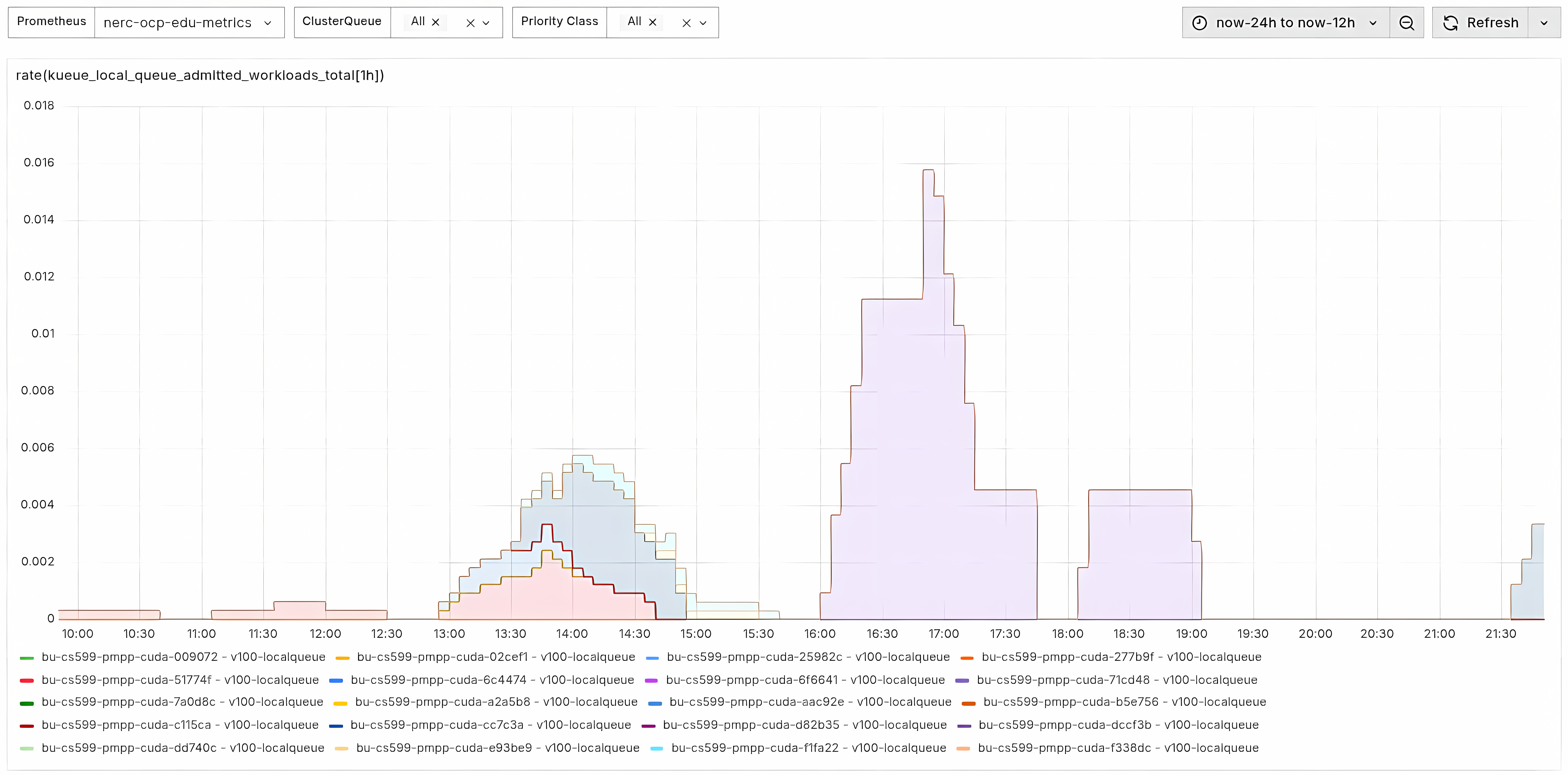 - Job Queues: Each student namespace has a LocalQueue that points to a ClusterQueue, which represents the overall pool of GPUs (Nvidia V100, A100, H100) available in the academic cluster.